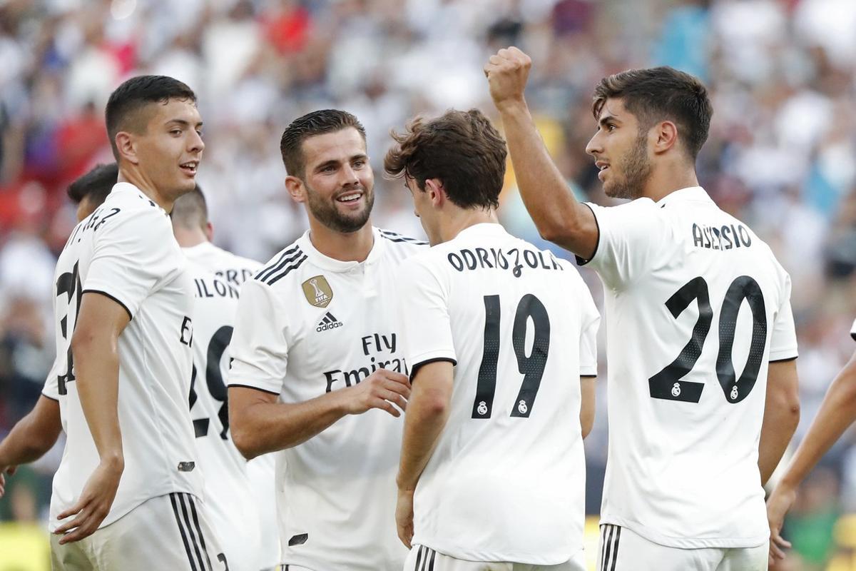 Aug 4 2018 Landover MD USA Real Madrid midfielder Marco Asensio 20 celebrates with teammates after scoring a goal against Juventus in the second half during an International Champions Cup soccer match at FedEx Field Real Madrid won 3-1 Mandatory Credit Geoff Burke-USA TODAY Sports /