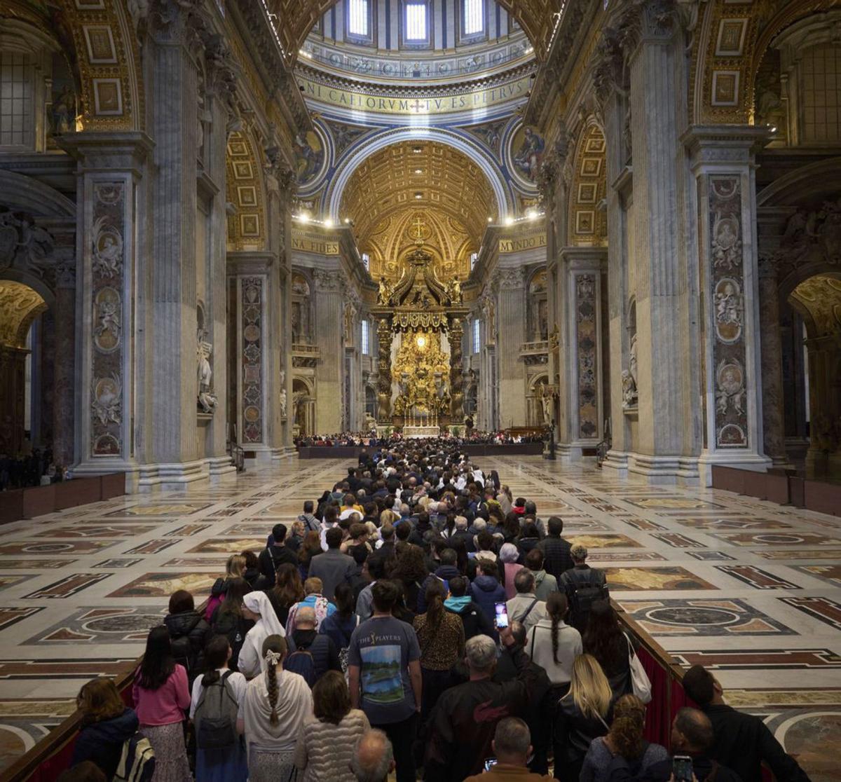 Cua de fidels per acomiadar-se del papa Francesc, ahir a la basílica de Sant Pere (a baix, esquerra i centre), i la tomba que acollirà el Pontífex a la basílica de Santa Maria Major, consistent en una senzilla llosa de marbre a terra i una creu (a la dreta). | EMILIO MORENATTI / A. TARANTINO / AP / VATICÀ / EFE /