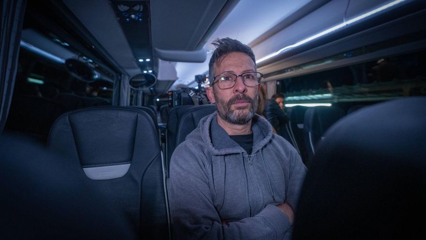 Sergio Busquets puja a les 7.30 hores al bus habilitat per Renfe a l’estació de Centelles. Passatgers procedents de Vic baixen del tren i es disposen a agafar el bus habilitat. /