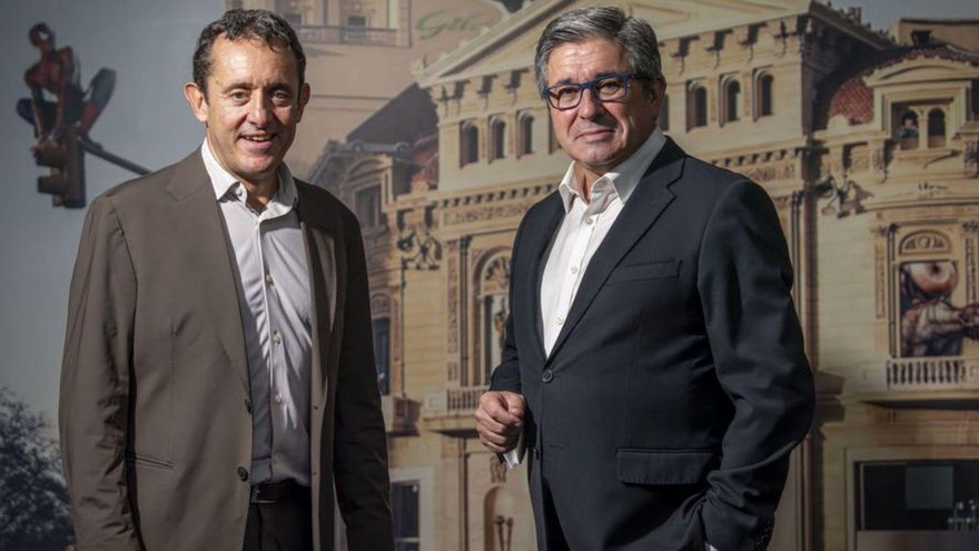 Jordi Artigas, arquitecte, i Joan Manuel Sevillano, de Stoneweg, davant d’una imatge de la façana del Comèdia que hi ha al cine. | MANU MITRU /