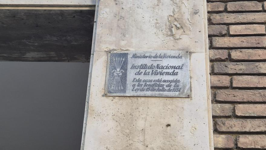 Placa del Ministeri d’Habitatge franquista, amb el jou i les fletxes, davant del Turó Park, a Barcelona. /