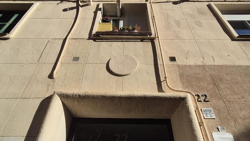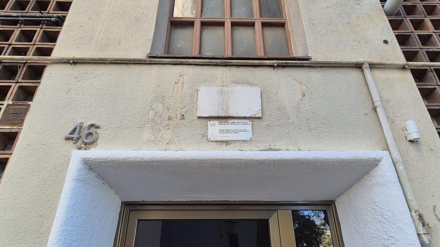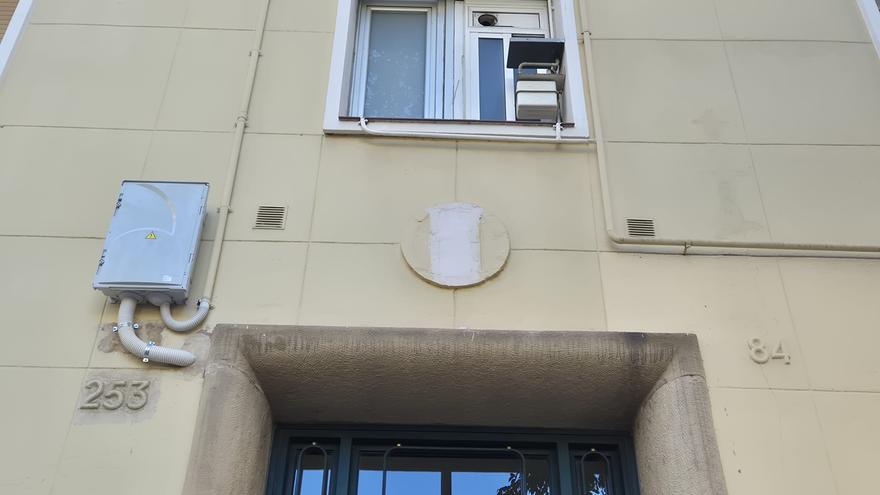Una placa de l’època franquista tapada en un bloc del districte de Sant Martí, a Barcelona. /