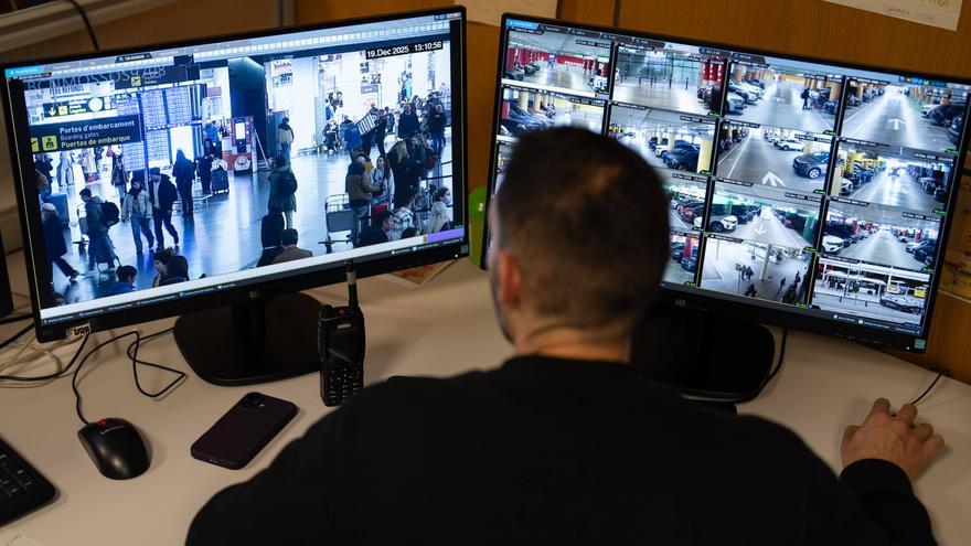 Agents dels Mossos d’Esquadra supervisen en temps real les càmeres de videovigilància de l’Aeroport de Barcelona-el Prat. /