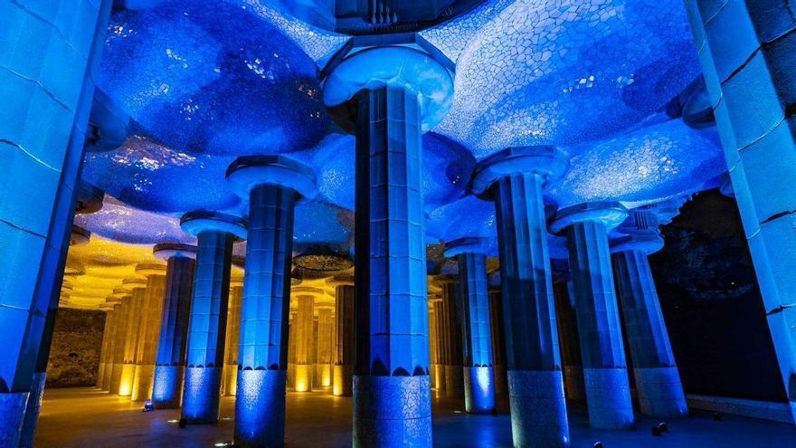 Il·luminació blava a la Sala Hipòstila del Park Güell amb motiu de la Capitalitat Mundial de l’Arquitectura. /