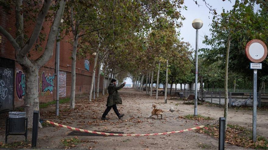 Un home juga amb un gos al parc del Litoral, a Sant Adrià de Besòs. /