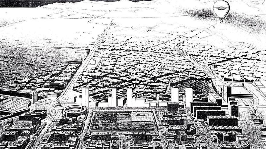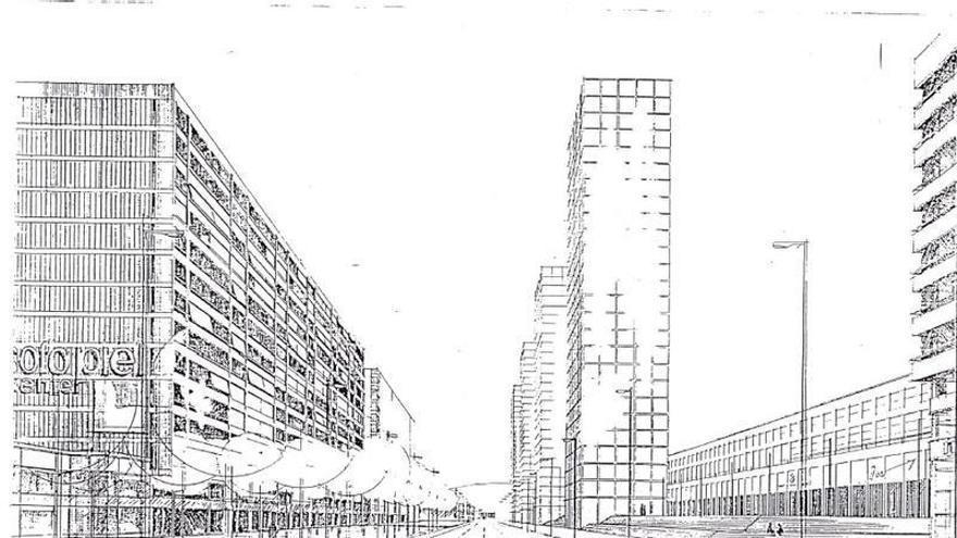 La vista proyectada en 1987 desde la actual avenida Josep Tarradellas de las torres planificadas en la calle Tarragona, en Barcelona. /