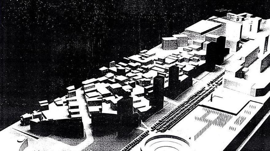 Una maqueta del 1987 amb les torres projectades al carrer Tarragona, des de l’entorn de l’estació de Sants i la plaça Espanya, a Barcelona. /
