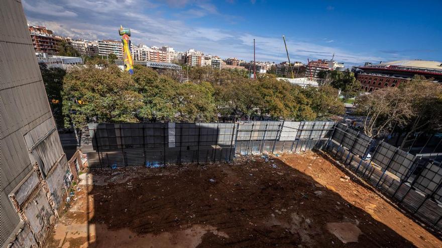 El solar situat davant l’escultura ‘Dona i Ocell’, de Joan Miró, en el qual es construirà una torre de 20 plantes, a Barcelona. /