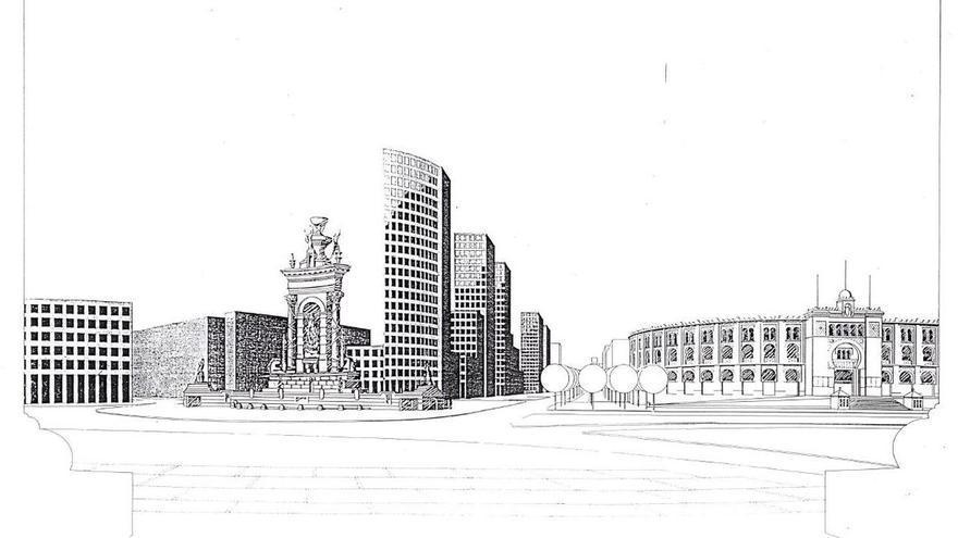 Esbós de les torres d’oficines tal com es concebien el 1987 per al carrer Tarragona, vistes des de la plaça Espanya, a Barcelona. /