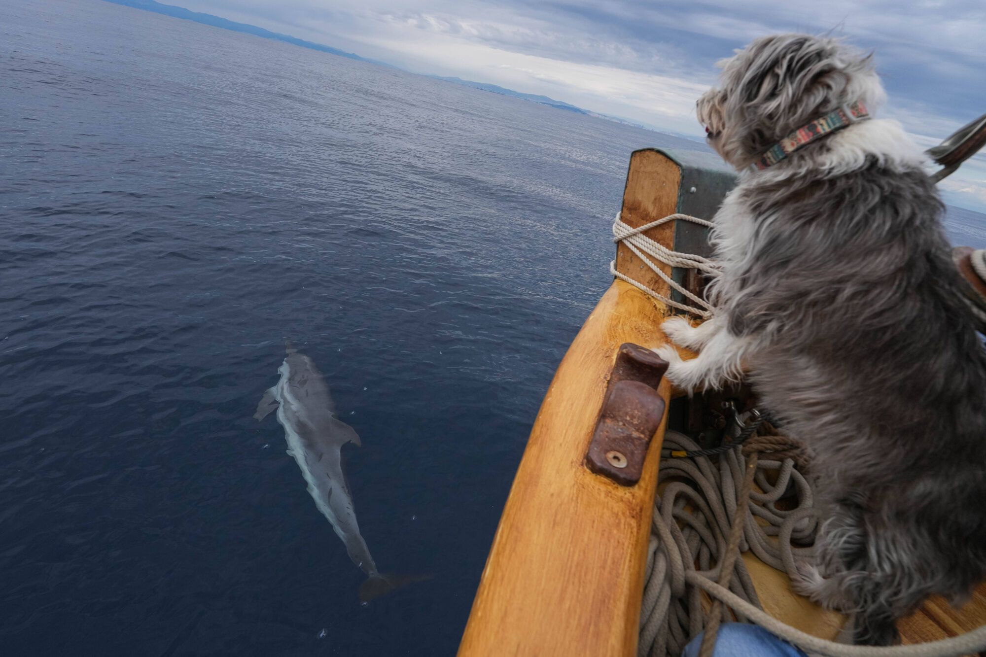 Tant te’l pots trobar al timó com enfilat a un pal del vaixell amb prismàtics. Sergi Rodríguez, 42 anys, en fa 12 que navega amb una gosseta marinera: Nirvana. És la que es passeja pel vaixell amb mirada saberuda de Capità Pescanova. “Li encanta veure saltar els dofins a la proa”, diu el capità amb to paternal. En aquesta última sortida es van topar amb un grup de 150.