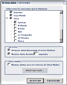 En el centro de la página de 'Opciones' puede seleccionar si desea que ÚLTIMA HORA se ejecute siempre que encienda el ordenador. Si no, será necesario ejecutar manualmente el programa desde el escritorio o el menú Inicio.