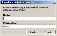 Es posible añadir noticias de otros medios de comunicación que no estén presentes en el listado con la opción 'Añadir otro medio', en la que hay que introducir el nombre del medio y la dirección de su fichero RSS.