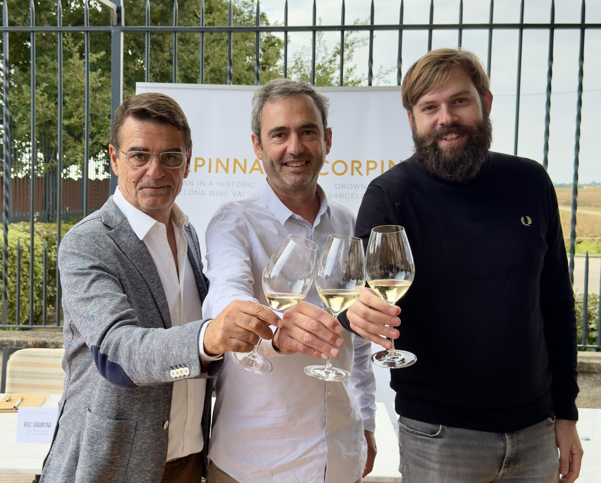 Xavier Nadal, a la izquierda; Pere Llopart, en el centro, y Roc Gramona, a la derecha, brindan tras la presentación de los resultados de la cosecha de Corpinnat de 2025. /
