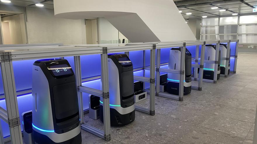 Els robots repartidors de Naver descansant a les seves estacions a les seves oficines a Seül. /