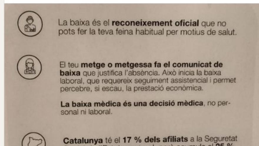 És per això que ha empaperat els taulons informatius de múltiples centres de salut amb fulls amb aquest missatge, així com publicat posts a les xarxes socials. S’hi recorda que «la baixa mèdica és una decisió mèdica, no personal ni laboral» i que «quan utilitzem la baixa laboral amb responsabilitat, reforcem la confiança, promovem la salut i contribuïm a una societat més justa i eficient».