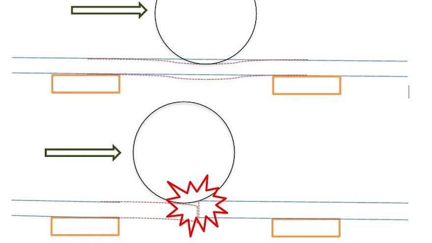 Possible mecanisme de formació de les marques a les rodes en cas d’haver-hi una ruptura de la continuïtat del carril. /