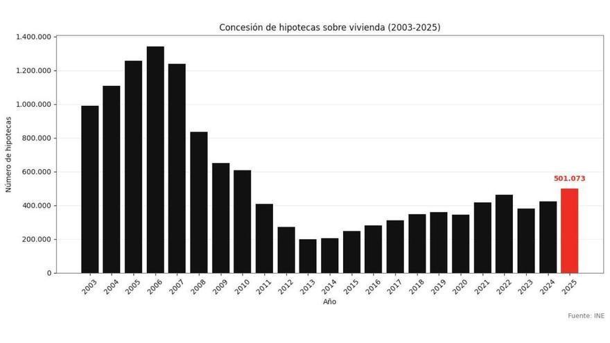 Les diferents entitats financeres van concedir el 2025 un total de 501.073 hipoteques, un 17,8% més que el 2024 i la xifra més alta registrada en els últims quinze anys, des del 2010, en plena desacceleració del mercat immobiliari arran de l’esclat de la bombolla immobiliària, segons les dades que ha fet públiques aquest dijous l’Institut Nacional d’Estadística (INE).