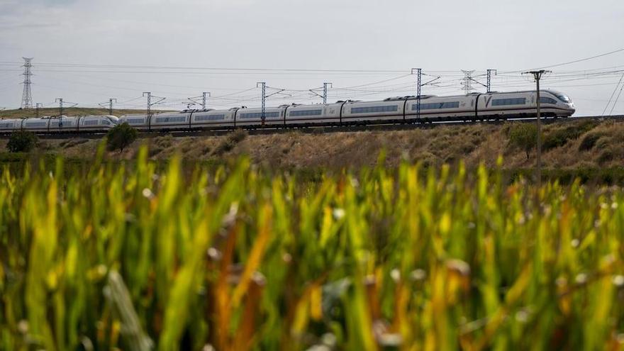 Un tren d’alta velocitat de Renfe en la línia entre Barcelona i Lleida, a l’altura d’Alcarràs. /