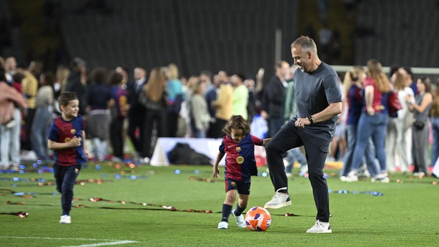 Hansi Flick amb la pilota als peus juga amb dos nens al finalitzar les celebracions pel títol de lliga durant el partit de lliga entre el FC Barcelona i el Vila-real a l’estadi Lluís Companys. /