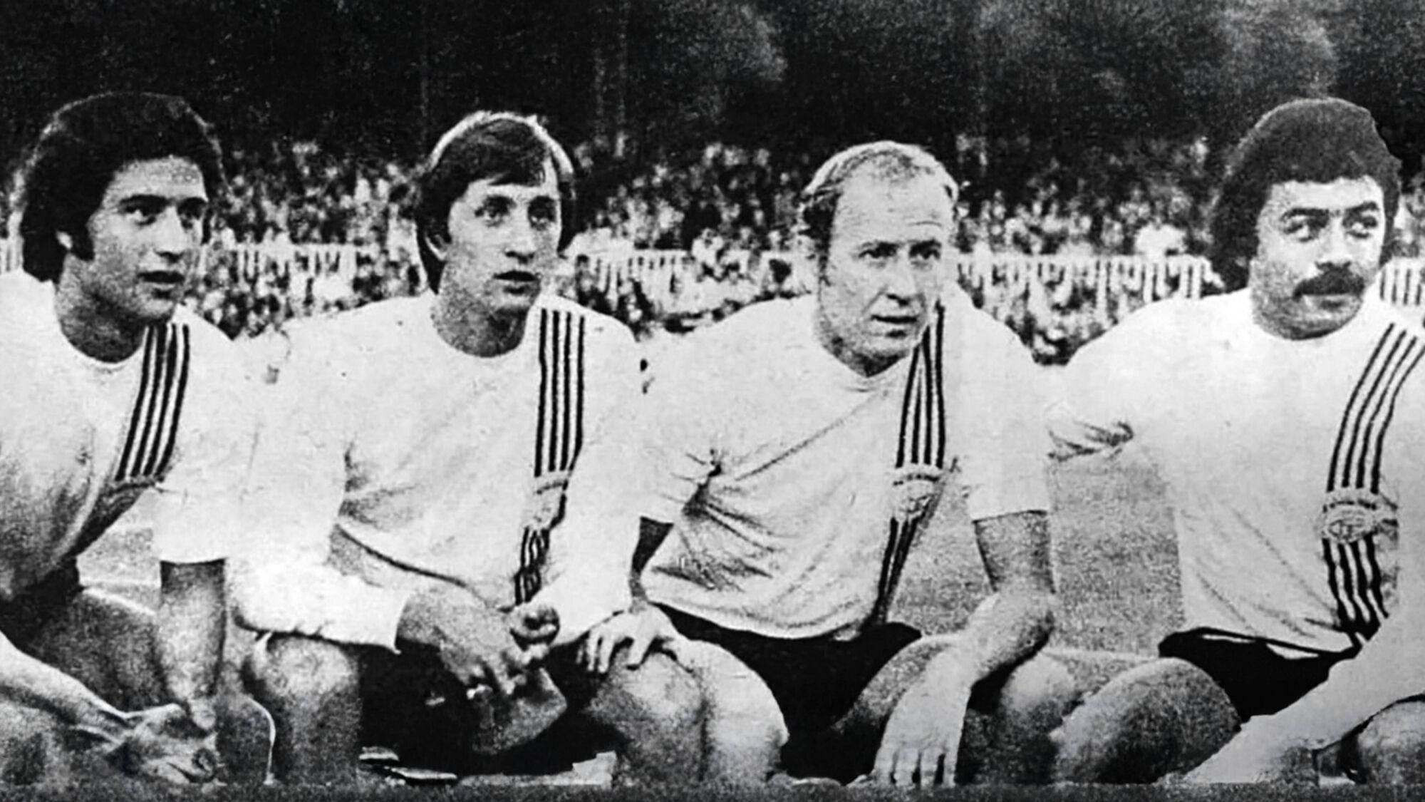 Solsona, Cruyff, Marcial Pina y Caszely, con la selección catalana el 9 de junio de 1976, en su partido contra la URSS en el Camp Nou. /