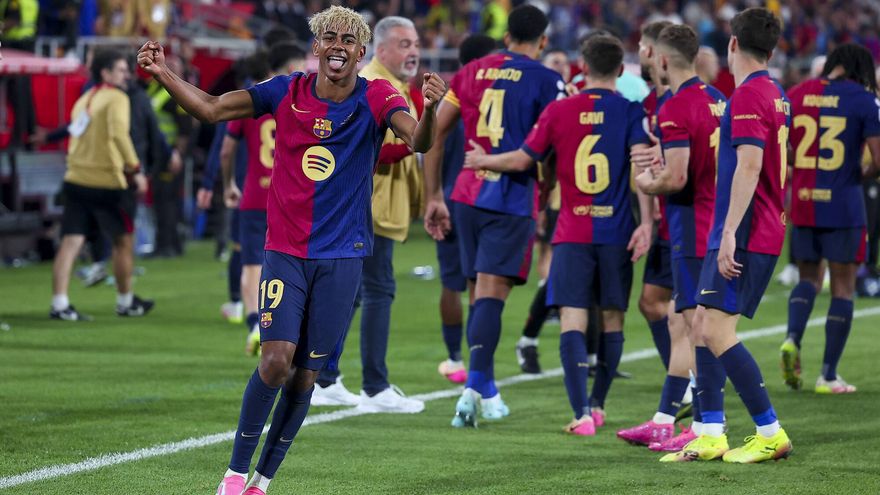 Lamine Yamal celebra el gol decisiu de Jules Kounde a la final de la Copa del Rei. /