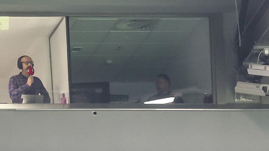 Hansi Flick, en una cabina de ràdio del Bernabéu. /