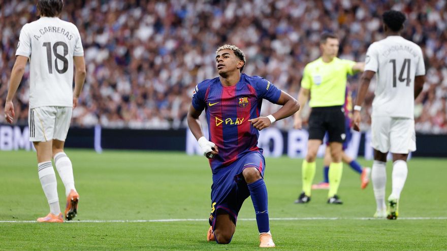 Lamine Yamal s’aixeca del terra en el clàssic. /