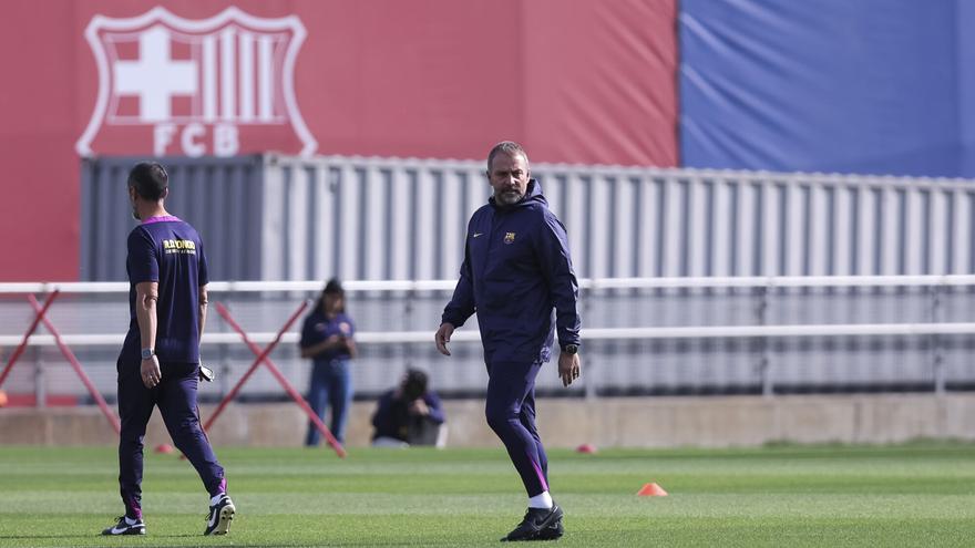 Hansi Flick, durant l’entrenament d’aquest dissabte a la Ciutat Esportiva. /