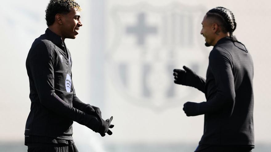 Lamine Yamal i Raphinha, en un entrenament a Sant Joan Despí aquest dilluns abans de volar a Londres. /