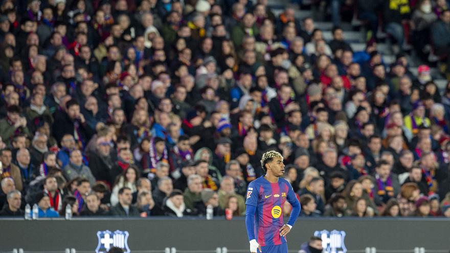 Lamine davant els aficionats blaugrana de la grada lateral durant el partit de Lliga entre el FC Barcelona i l’Athletic de Bilbao en la tornada a l’estadi del Camp Nou. /
