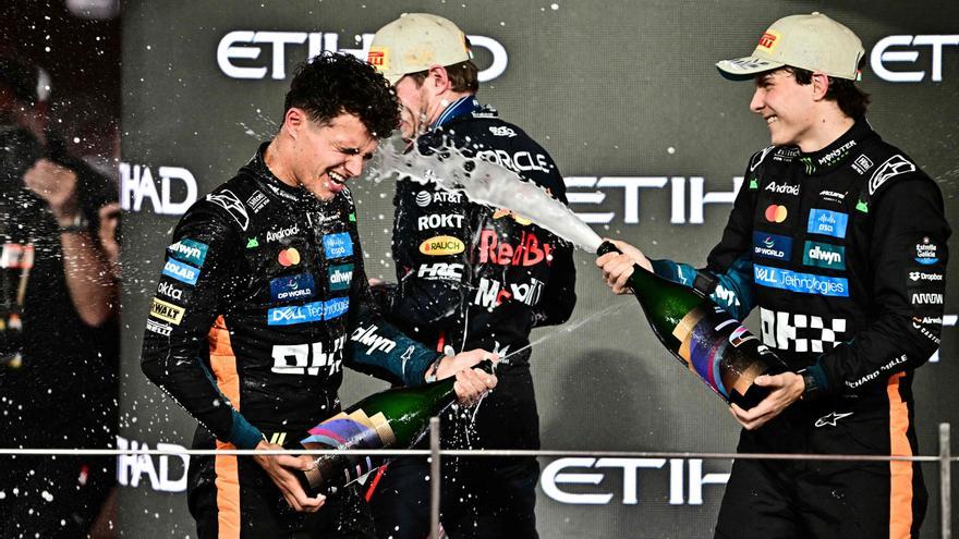 Piastri ruixa el seu company Lando Norris, davant la presència de Verstappen al podi d’Abu Dhabi. /