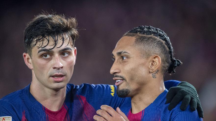 Raphinha, felicitat per Pedri celebrant el segon gol a l’Osasuna. /