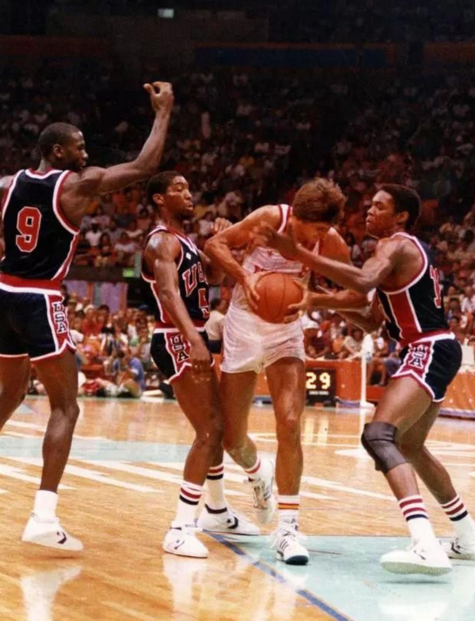 Jiménez mira d’avançar, amb Michael Jordan a l’esquerra (9), a la final dels Jocs Olímpics de Los Angeles 84. | JORDI OTIX /