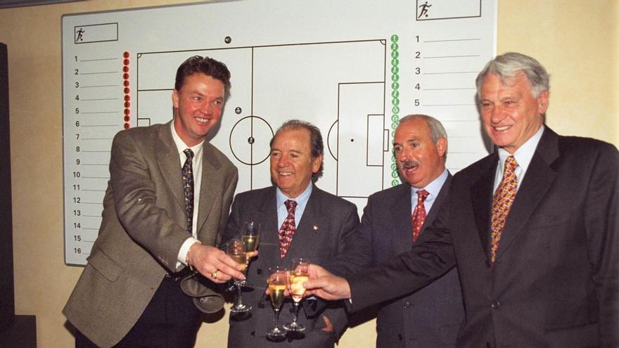 Louis van Gaal, Josep Lluís Núñez, Llorenç Serra Ferrer i Bobby Robson el 1997. /