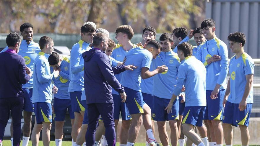 Hansi Flick fa broma amb la plantilla al començar l’entrenament d’aquest dimarts. /