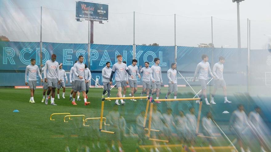 Els jugadors de l’Espanyol, en un entrenament a Sant Adrià. /