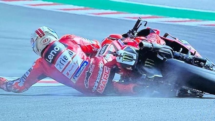 La caiguda d’avui de Marc Márquez (Ducati), a Austin, vista des de darrere. /