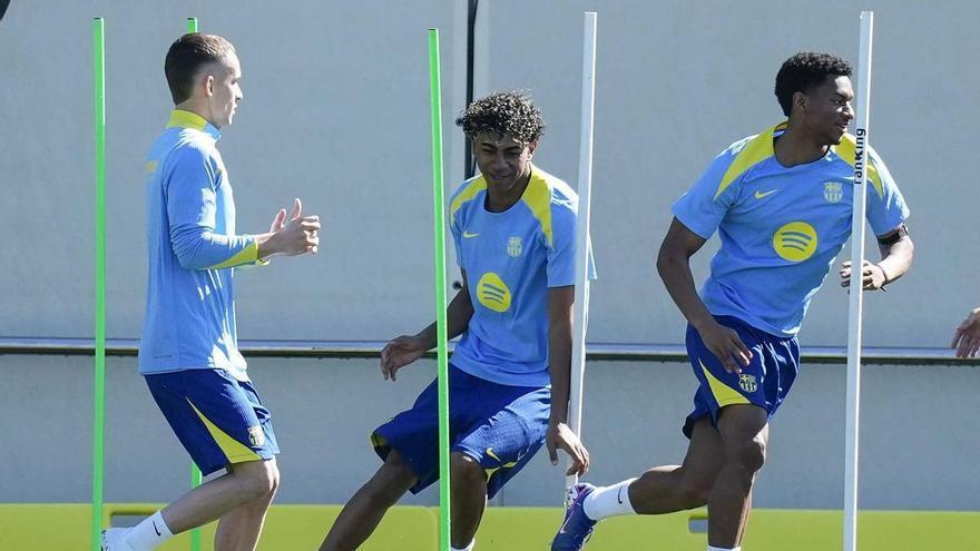 Marc Casadó, Lamine Yamal i Alejandro Balde, durant l’entrenament del Barça d’aquest dissabte. /