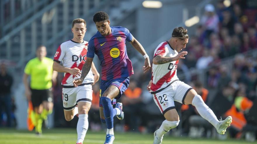 Rashford es cola entre Pacha Espino i De Frutos en l’últim partit contra el Rayo Vallecano al Camp Nou. /