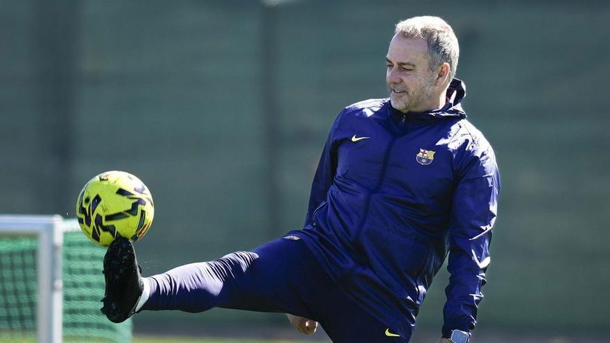 Hansi Flick s’entreté amb la pilota en els compassos inicials de l’entrenament previ a l’Atlètic-Barça de Lliga. /