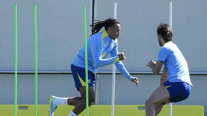 Jules Koundé i Ferran Torres durant l’entrenament del Barça d’aquest divendres. /