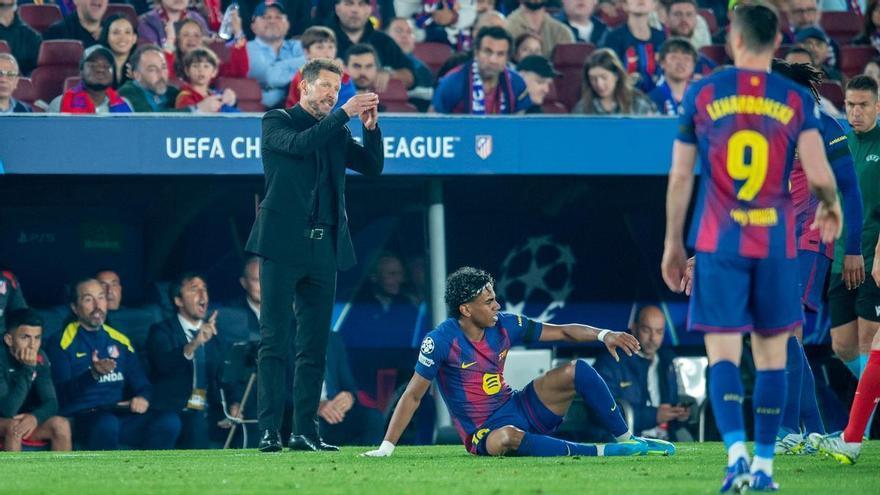 Diego Simeone gesticula en una falta comesa sobre Lamine Yamal. /