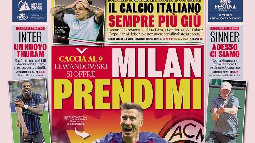‘La Gazzetta dello Sport’ mostra a tota portada Robert Lewandowski. ¿Per què? Segons el prestigiós rotatiu italià, el davanter polonès s’ha ofert a l’AC Milan per incorporar-se a les seves files aquest estiu com a agent lliure, una vegada conclòs el contracte amb el FC Barcelona.