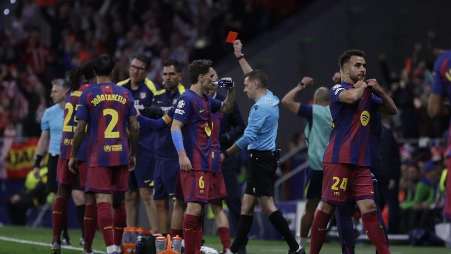 A una primera part que va vorejar en determinats minuts gairebé la perfecció –de 10 hauria sigut tenir punteria i contundència a l’àrea de l’Atletic– la va seguir després una segona meitat en què es va ofuscar en atac i va patir en defensa un vell problema: quedar-se amb 10. Va passar al Camp Nou, on Pau Cubarsí va ser expulsat (m. 44), i es va reproduir idèntica escena al Metropolitano, on Eric Garcia va acabar trasbalsat esquinçant-se la samarreta després de veure la targeta vermella (m. 79).