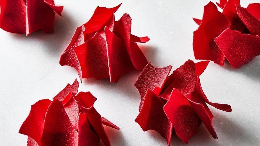 Hofmann ret homenatge a la tradició amb un pastís individual en forma de rosa que combina un pa de pessic de xocolata amb una galeta cruixent de vainilla. A l’interior, una subtil compota de litxis i rosa aporta notes florals i fresques, mentre que una mousse suau de xocolata negra i gerds envolta el conjunt amb intensitat i elegància. El toc final el posen els pètals de gerd, que evoquen visualment la rosa tradicional i afegeixen un contrast de sabor. Costa 135 euros.
