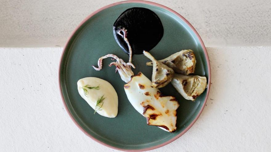 El calamar a la brasa amb salsa de tinta i carxofes de Fiskebar. /