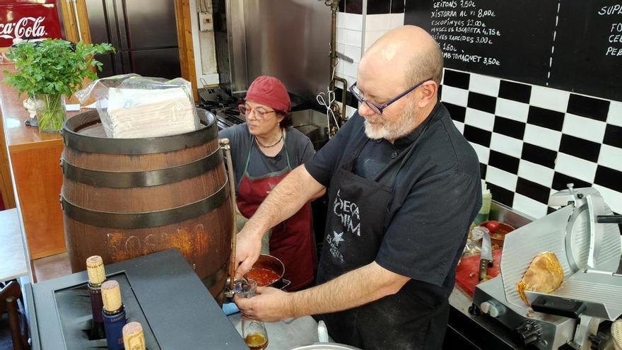 Abans de marxar i contagiat per un parroquià que s’ha endut dues garrafes, li demano a en Jordi una mica de vi ranci per emportar-me a casa. El cuiner somriu, atura la seva activitat i pren un temps per omplir l’ampolla. L’aixeta va a poc a poc i per un breu moment, sé que és només al meu cap, tot sembla alentir-se. A la taula del costat estan devorant un entrepà de pintxos; cap a la terrassa vola un de truita amb sobrassada i els últims cafès de l’esmorzar esgoten el seu viatge. Són les 11, i el matí és triomfant.