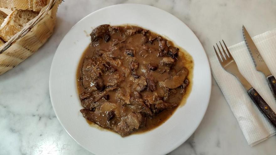 «Al fricandó hi posem vi ranci, però també hi posem vi del Priorat», explica el Jordi. És un fricandó de vedella ortodox, elaborat amb filets de llata i cama-secs (Marasmius oreades), que sovint a Barcelona es confonen amb el moixernó (Calocybe gambosa). Els primers, en castellà es coneixen com a ‘senderuelas’, i els segons, com a ‘perrechicos’, però per raons que se m’escapen, a la nostra ciutat solem anomenar els cama-secs, ‘moixernons’. En tot cas, tornem al menjar, perdó per la digressió. El plat llueix terrossenc, té el color del vi ranci i de la cuina de temps prolongat. Fa una olor que alimenta, el guisat demana pa a crits i jo demano «una cullera, sisplau». És tot el que un purista del gènere demanaria a un fricandó i tot el que necessito jo per recuperar l’optimisme sobre la supervivència de la cuina tradicional catalana. Hi ha llum al final del túnel, i en la llum, hi ha fricandó.
