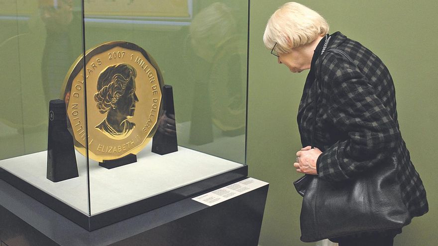 Una dona que observa la moneda gegant ‘Big Maple Leave’ de 100 quilos exposada al Museu Bode a Berlín i que va ser robada el 2017. /