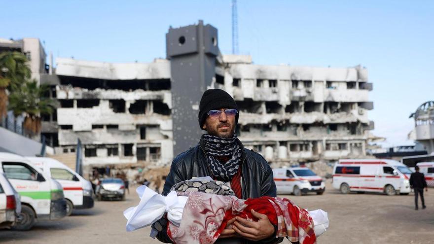 El cos del nadó palestí Shatha Abu Jarad, de tres mesos, que va morir a causa del fred segons els metges, és portat pel seu oncle a l’Hospital Al-Shifa de la ciutat de Gaza el 20 de gener del 2026. Les condicions de vida quotidianes per a la gran majoria dels residents de Gaza continuen sent extremadament precàries, amb més del 80% de la infraestructura destruïda, segons les Nacions Unides. Diversos treballadors humanitaris i de l’ONU van declarar a l’AFP que, si bé la situació ha millorat en algunes zones des del cessament del foc, la resposta humanitària continua sent insuficient a causa de les restriccions d’accés imposades per les autoritats israelianes, que neguen aquestes afirmacions. Les xarxes d’aigua i electricitat, així com la gestió de residus, ja no funcionen. /
